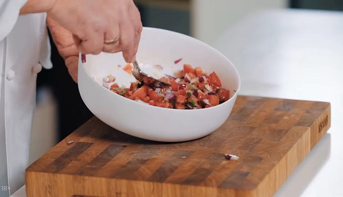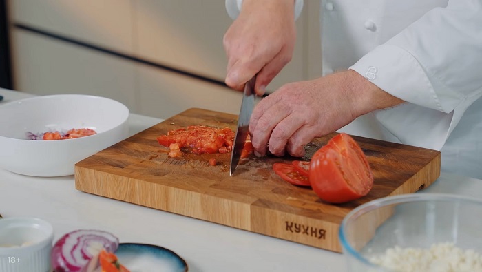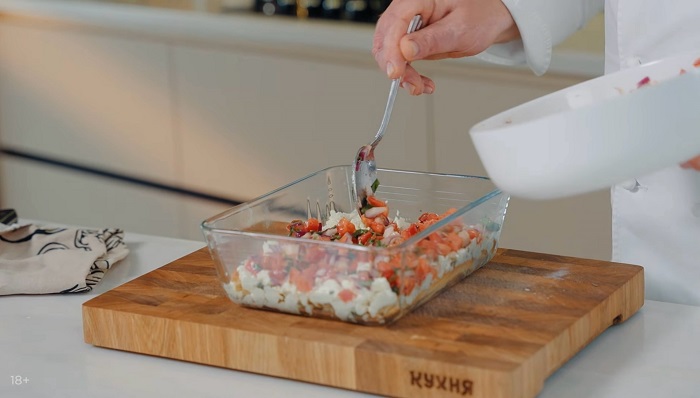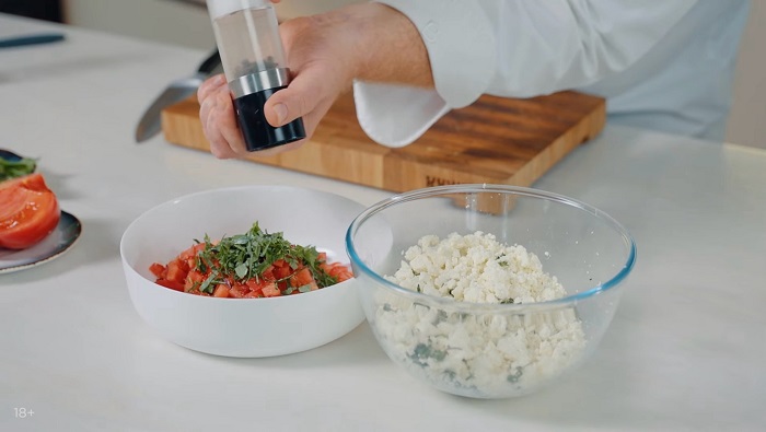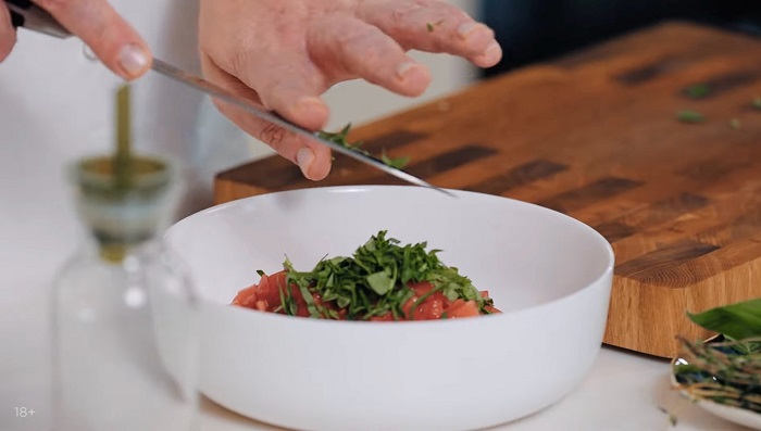 Помидоры тоже нарезаем кубиком, закидываем к луку, туда же нарезаем базилик, добавляем специй и немного оливкового масла, мешаем. -