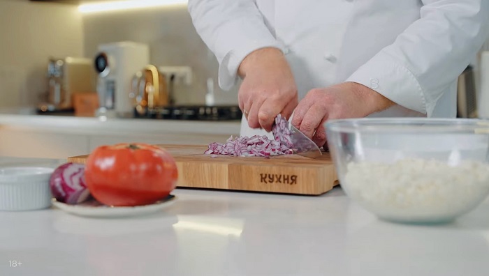 Нарезаем кубиком красный лук, натираем к нему зубчик чеснока. -