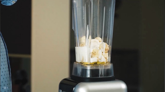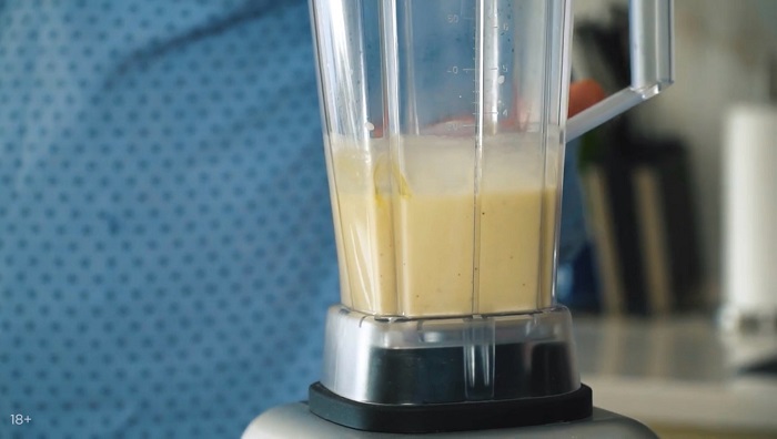 В блендер вливаем мёд, режем и добавляем 3 банана, вливаем кефир и взбиваем. -