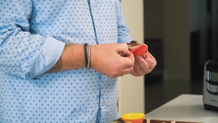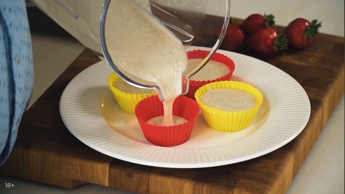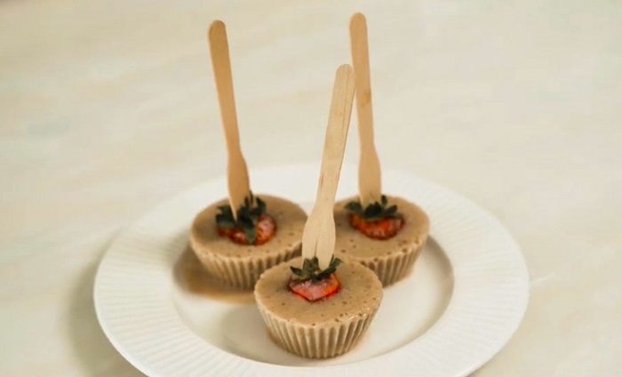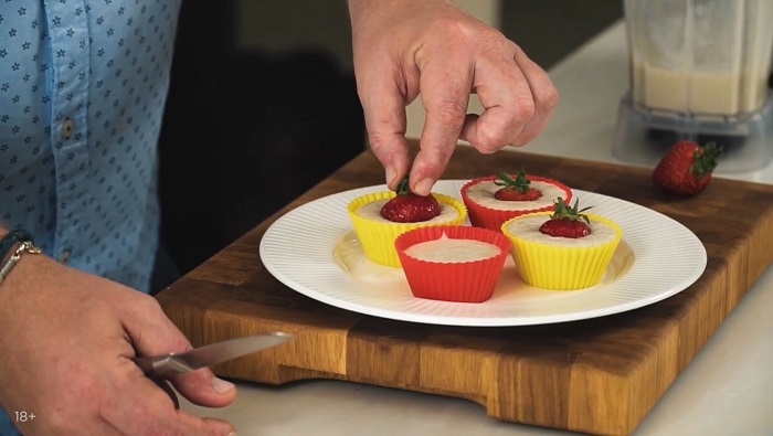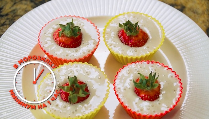 Вкладываем в центр каждой формы клубничку и отправляем десерт в морозилку минимум на 1 час. -