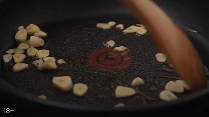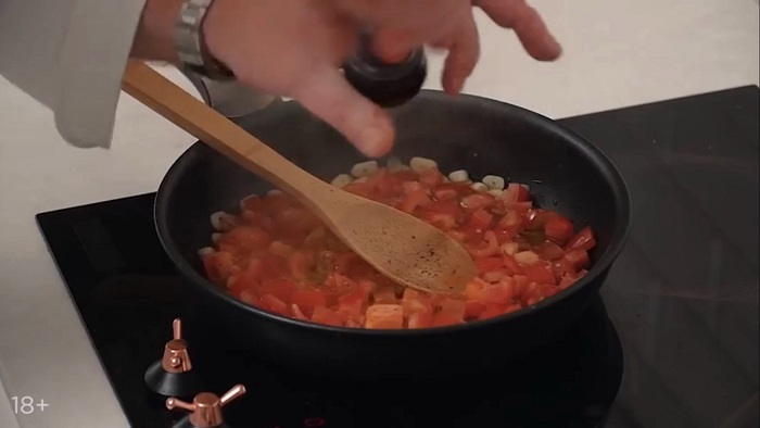 На оливковом масле начинаем обжаривать чеснок, затем добавляем помидоры, солим, перчим и обжариваем в течение двух минут. -