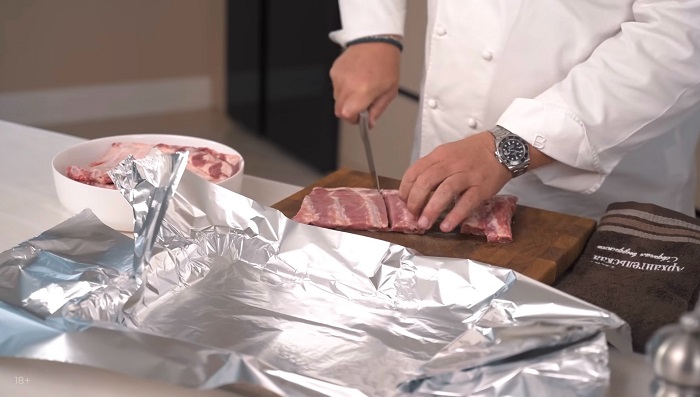 В лоток для запекания выкладываем фольгу так, чтобы её краями затем можно было накрыть рёбрышки.Рёбра нарезаем и выкладываем в лоток, солим, заливаем перечным соусом и накрываем фольгой. -