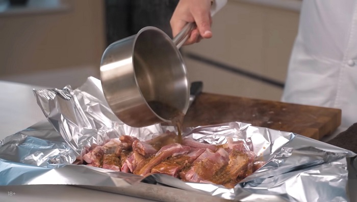 Отправляем ребра в духовку, разогретую до 230 градусов, на 25 минут. За 5 минут до готовности открываем духовку, разворачиваем края фольги, ставим духовку на максимальную температуру, запекаем ещё 5 минут и вкуснейшие свиные рёбрышки в перечном соусе от шефа готовы!