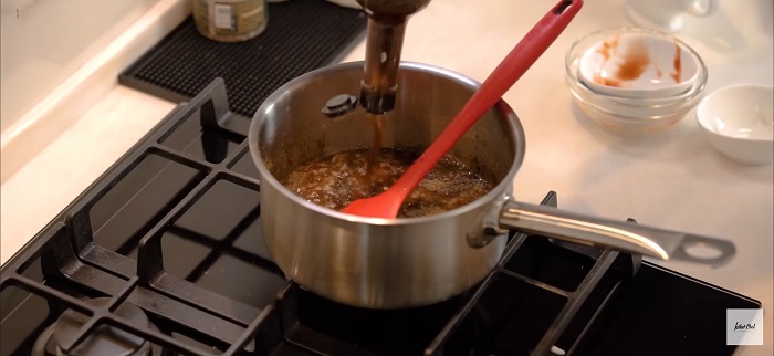 Добавляем сладкий чили соус, соевый соус, сахар, кетчуп, чёрный молотый перец, небольшое количество вотчестера и 100 мл воды. Соус томим на медленном в течение 10 минут. -