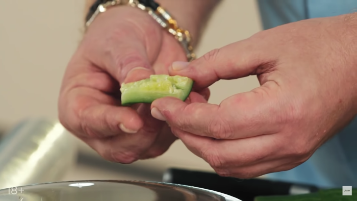 Салат из битых огурцов делается из длинных огурцов. Берём огурец, обворачиваем в пакет и бьём по нему так, чтобы снаружи он оставался целым, а внутри полопался. Дальше порезать так, как любите. -