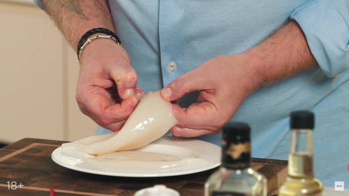 Сначала подготавливаем кальмар. Разморозить обязательно нужно естественным путём, затем отчистить от плётки и забросить в кипящую воду на две минуты. Затем останавливаем тепловой процесс, для этого опускаем кальмар в холодную воду и держим пару минут. Кальмар готов. -
