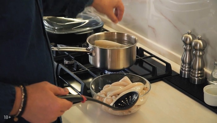 Кальмары закидываем в кипящую воду на 1 минуту, а затем перекидываем под холодную воду и просушить. -