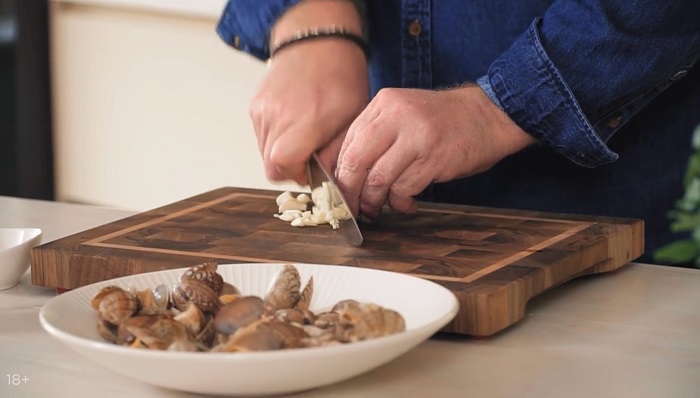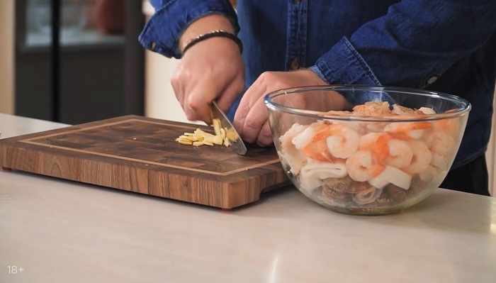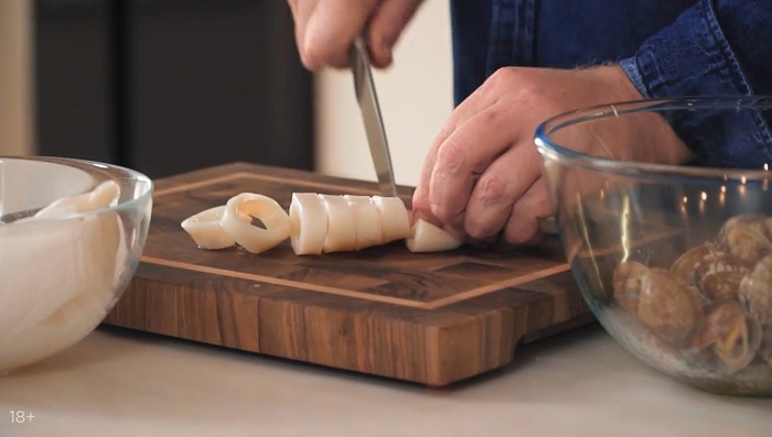 Вводим вонголе, нарезанные кольцами кальмары и креветки. -