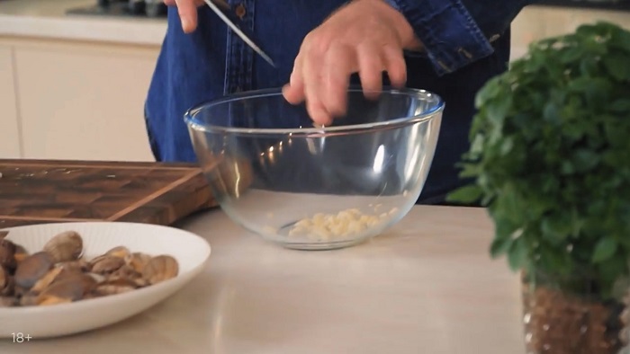 Для маринада чеснок давим, мелко нарезаем и закидываем в миску, добавляем оливковое масло. -