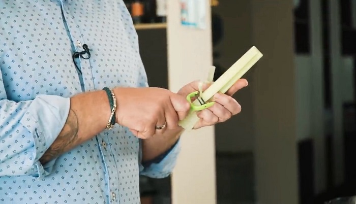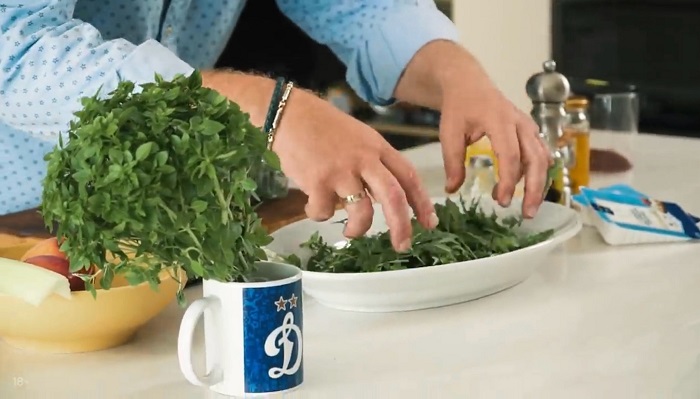 Рукколу выкладываем в блюдо, солим. Стебель сельдерея очищаем, нарезаем и выкладываем сверху. -