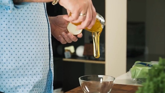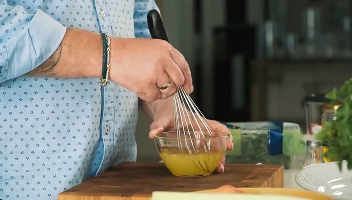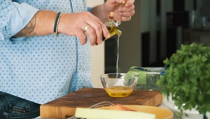 Для начала сделаем заправку. Для этого мёд замешиваем с соком лимона, оливковым маслом и небольшим количеством воды. -