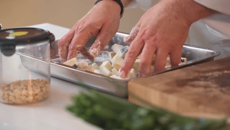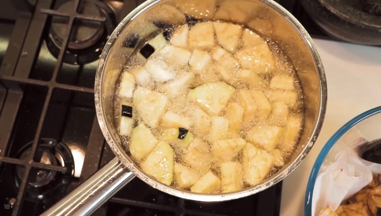 Баклажан очистим от кожуры, нарежем его крупными ломтиками и хорошо обваляем в крахмале, поставим разогреваться кастрюлю с большим количеством масла, в которой мы будем фритюрить баклажаны. -