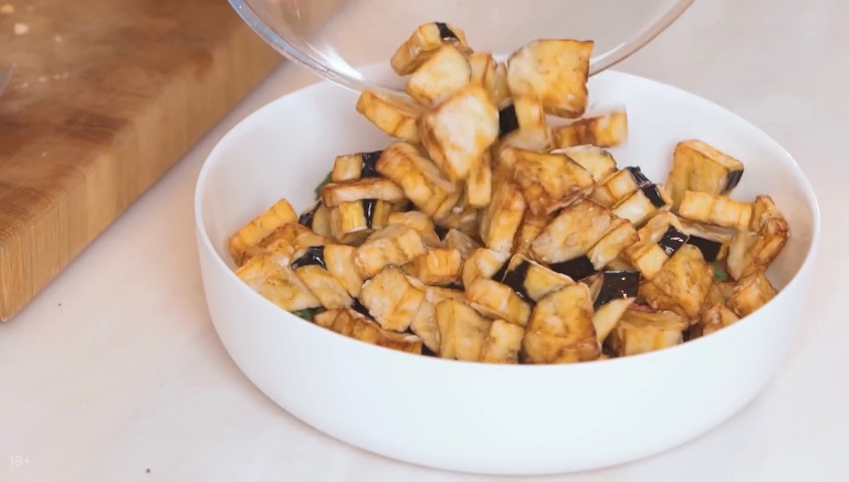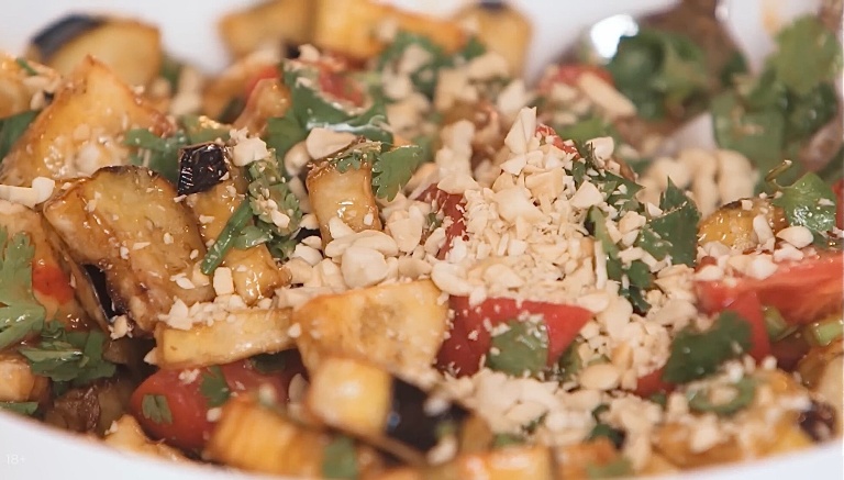 Выложим баклажаны к салату, добавим соли и хорошо всё перемешаем. И наш вкуснейший салат с баклажанами и томатами в паназиатском стиле от Константина Ивлева готов.