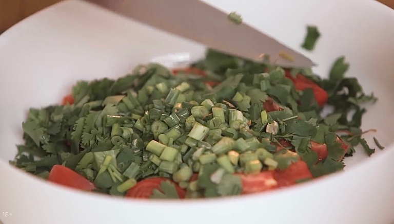 Нарежем основу для салата - томаты, зелёный лук и кинзу. -