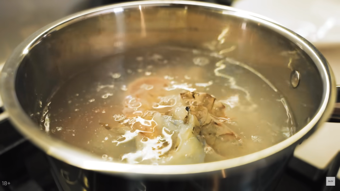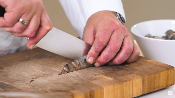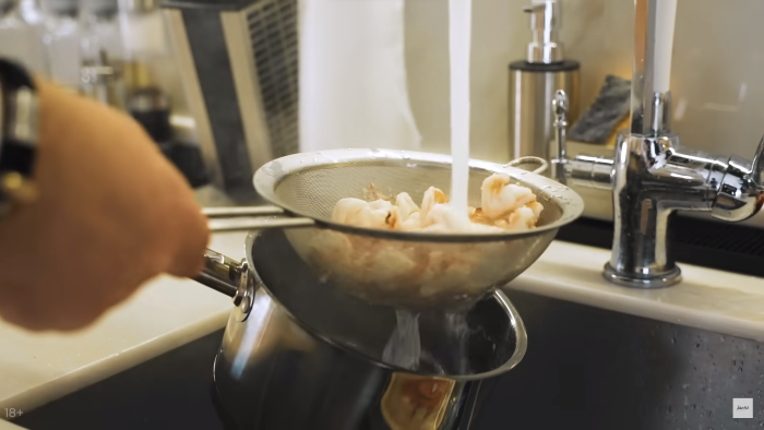 Сначала мы подготавливаем креветки. Чистим, надрезаем вдоль, варим 5 минут (можно пожарить, кто как любит) и промываем -