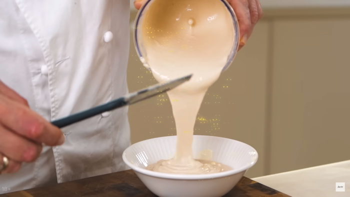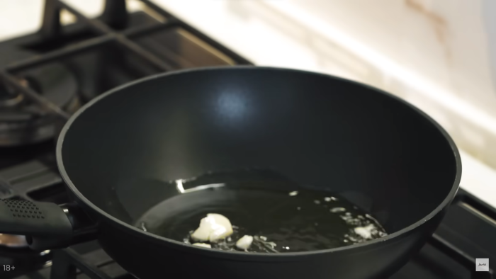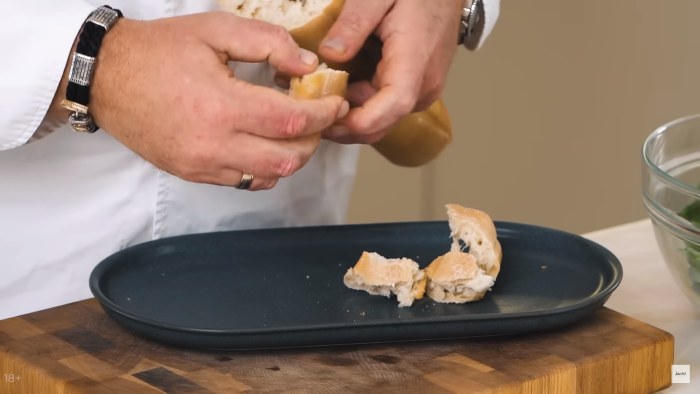 Можно использовать самые обычные покупные гренки, но если сделать как Константин Ивлев, то пальчики оближешь... В растительном масле обжариваем раздавленный чеснок, затем убираем чеснок и в этом масле обжариваем чиабатту со свежим тимьяном до золотистого цвета -