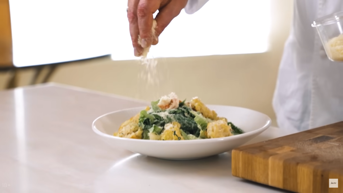 Листья салата романо заправляем соусом "Цезарь", выкладываем креветки, чиабатту и всё это посыпаем мелко натёртым пармезаном. Легендарный "Цезарь" от Константина Ивлева готов. Приятного аппетита!