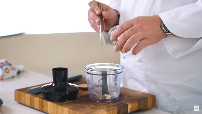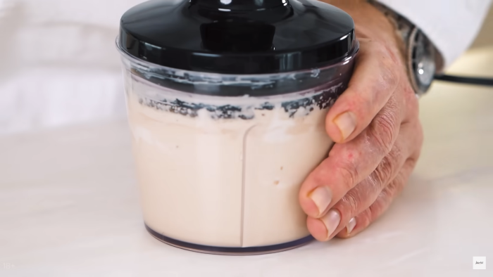Теперь готовим фирменную заправку для салата. Майонез – 320 г Соус соевый – 10 г Анчоусы – 15 г Чеснок – 4 зуб. Пармезан – 20 г Взбиваем до однородной массы в блендере. Так как масса очень густая, можно разбавить молоком ( Как Шеф Ивлев) или водой -