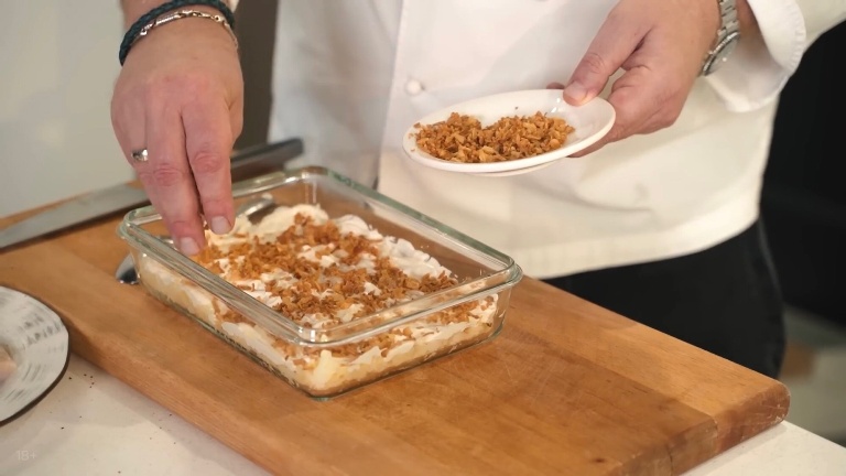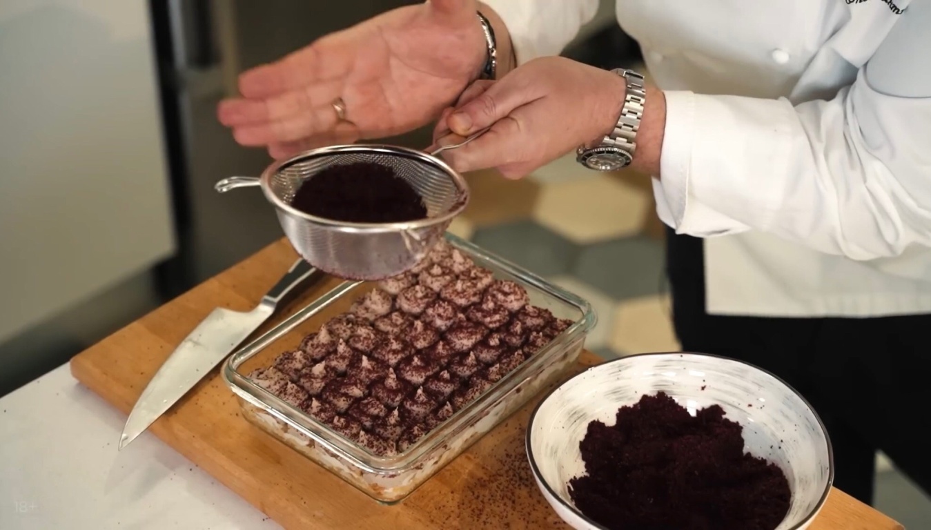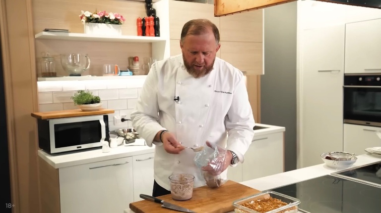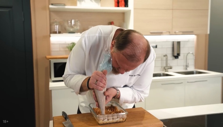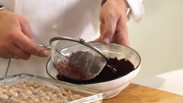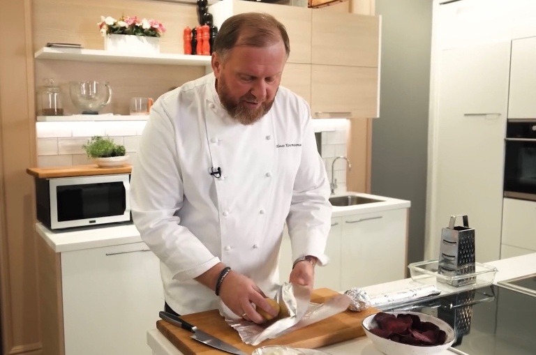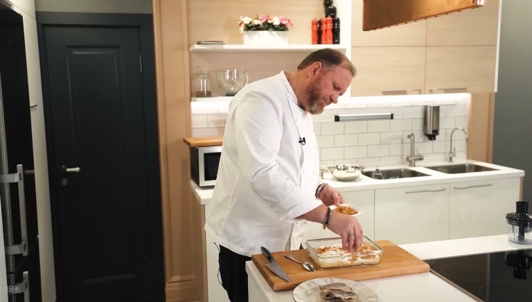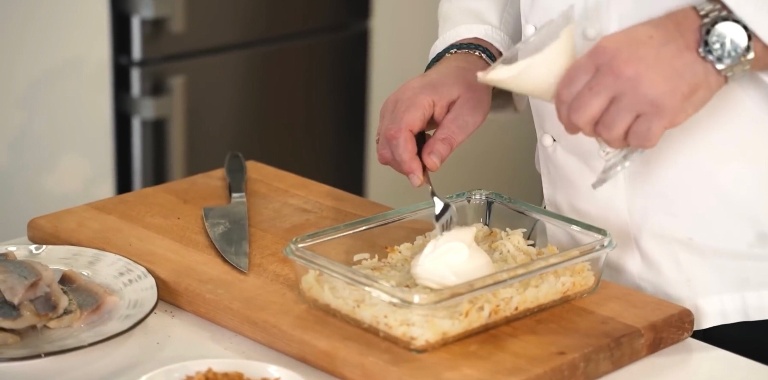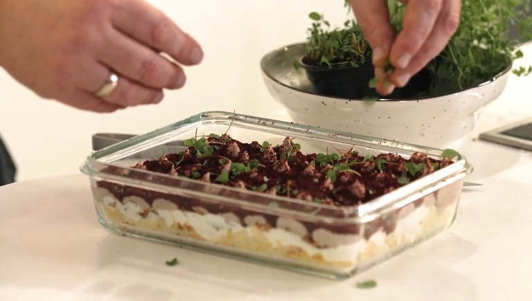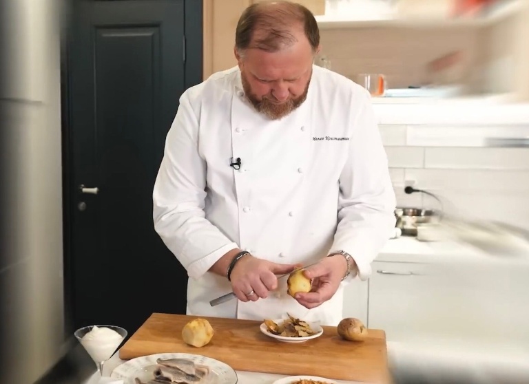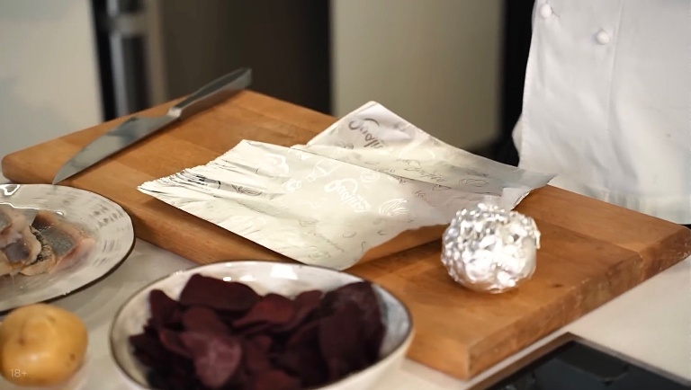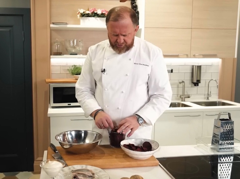 Через сито просыпаем свекольную "пудру" сверху, микрозеленью украшаем сверху. Вот и всё, селедка "новый стиль" под шубой от шефа Ивлева готова!