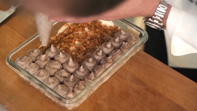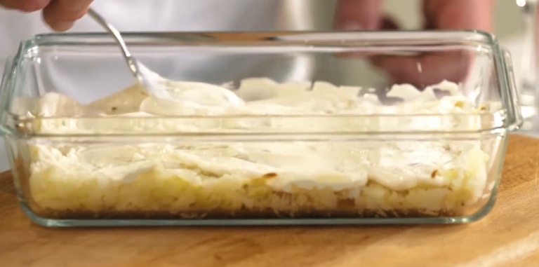 Перекладываем пюре из сельди в кондитерский мешок, на конце которого делаем надрез и "завитушками" выдавливаем на лук. -