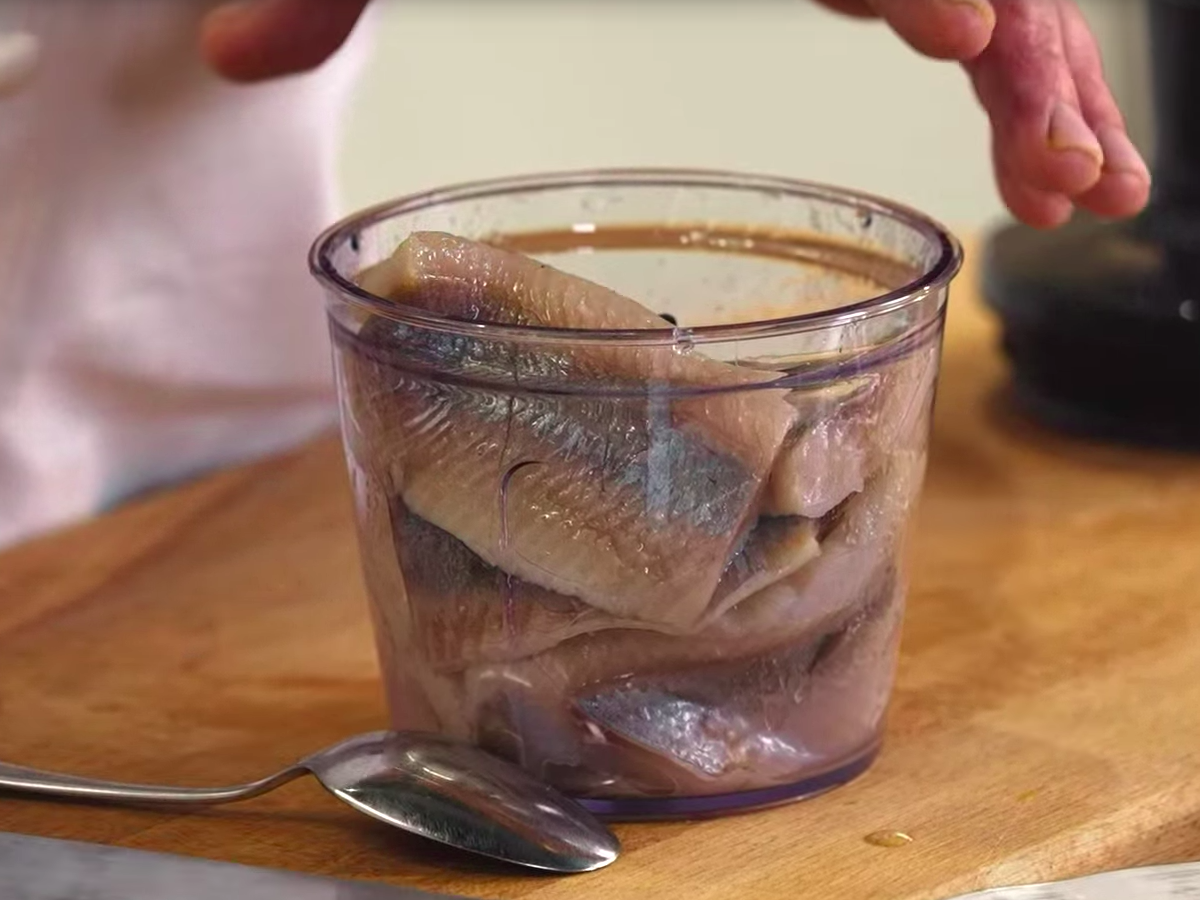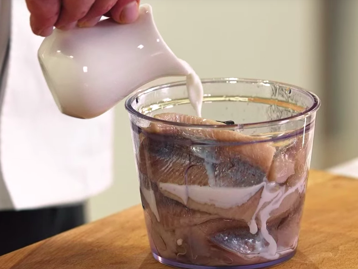 Приготовление селедочного крема: Поместите филе сельди в блендер. Добавьте молоко. Взбейте все ингредиенты до получения однородной кремообразной массы. Переложите получившийся крем в кондитерский мешок. -