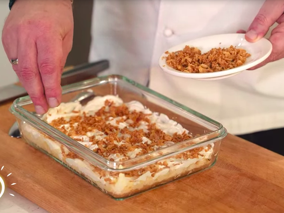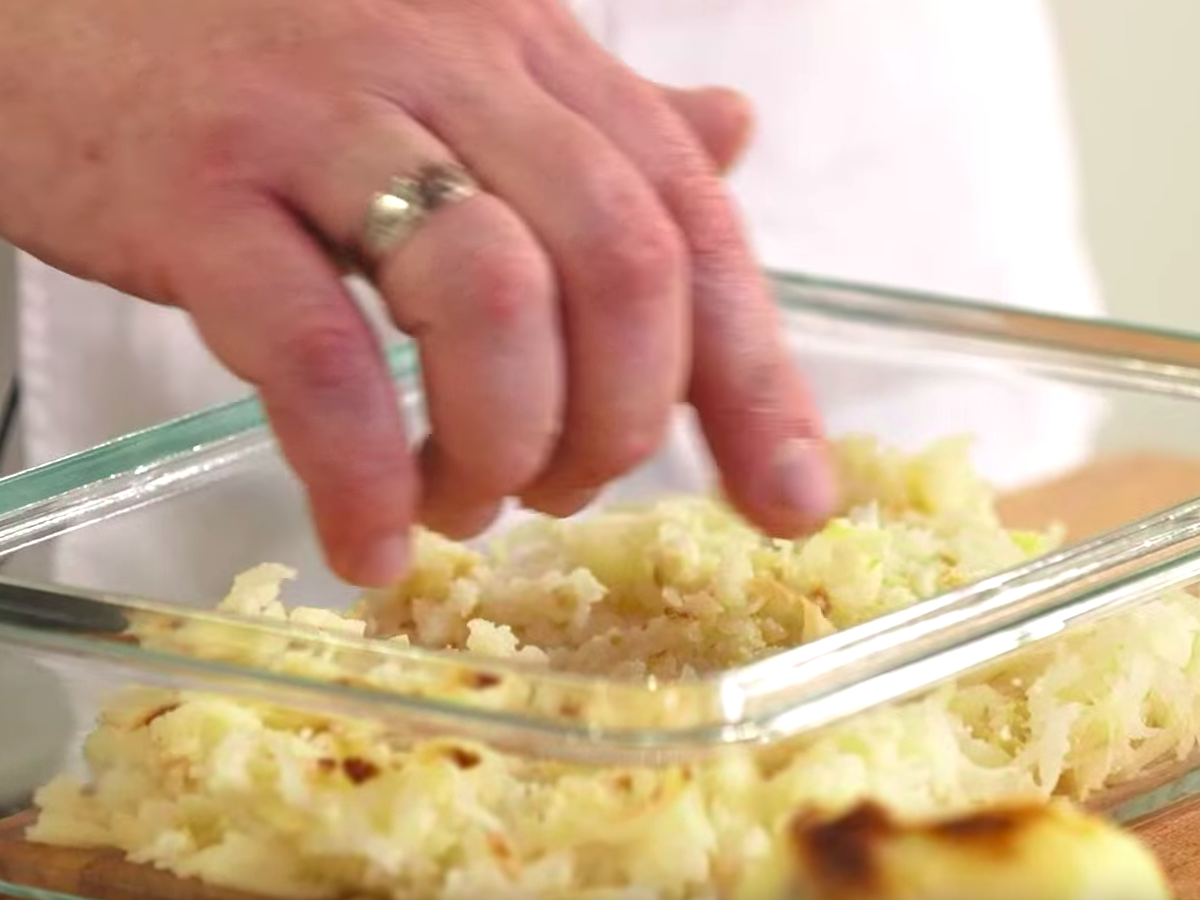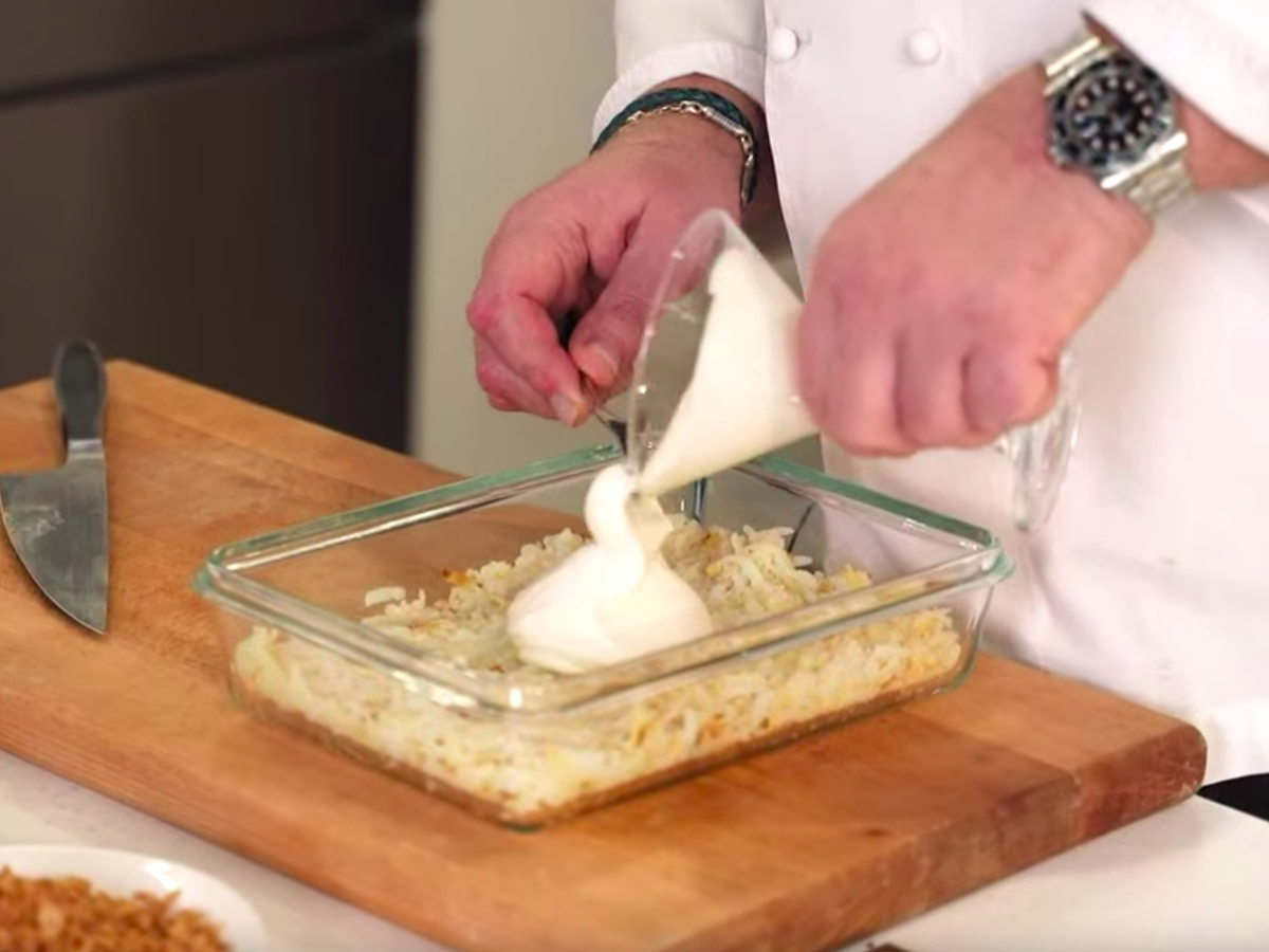 Сборка блюда: После того как картофель запекся, аккуратно очистите его от кожуры. Натрите запеченный картофель на крупной терке. Выложите его первым слоем на сервировочное блюдо. Равномерно покройте картофельный слой майонезом. Сверху посыпьте хрустящим жареным луком. -