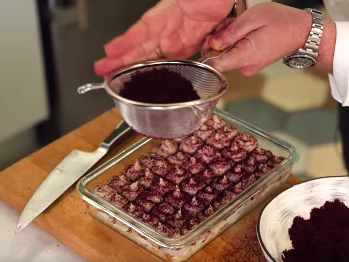 Завершающий этап: С помощью кондитерского мешка сформируйте следующий слой блюда из селедочного крема. Посыпьте сверху приготовленной свекольной пудрой. Украсьте блюдо свежей микрозеленью. Приятного аппетита!