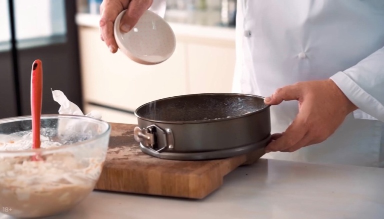 Берем форму для запекания и смазываем её сливочным маслом, а затем слегка обсыпаем сахаром. Выкладываем тесто в форму, утрамбовываем и отправляем запекаться в духовку при температуре 180 градусов, 40 минут и наша нежнейшая и вкуснейшая шарлотка по фирменному рецепту шефа готова!