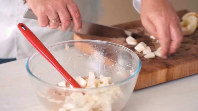 Яблоки нужно очистить, затем нарезать средними ломтиками и отправить к тесту. -