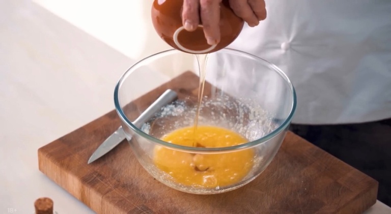 В миску высыпаем сахар, к нему же выливаем яйца и всё хорошо перемешиваем. -
