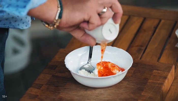 Приготовим соус: творожный сыр замешиваем с сладким чили соусом и соусом терияки. -