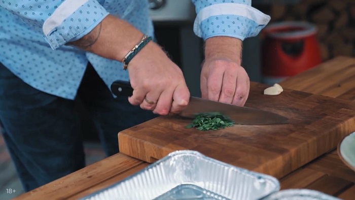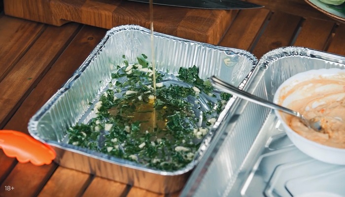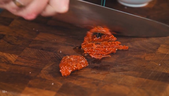 Мелко нарезаем чеснок и петрушку, замешиваем вместе с небольшим количеством оливкового масла, а также добавляем туда немного масла из под вяленых томатов. -