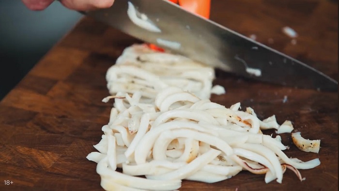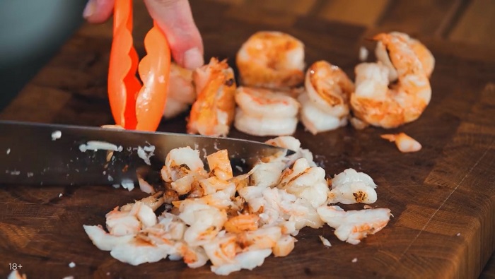 Обжаренные морепродукты мелко рубим, перекладываем в чесночное масло, солим, перчим и перемешиваем. -