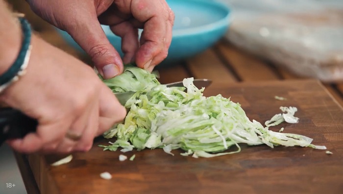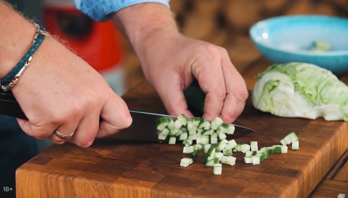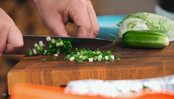 Мелко нарезаем вяленные томаты, огурец, зеленый лук и салат айсберг. -