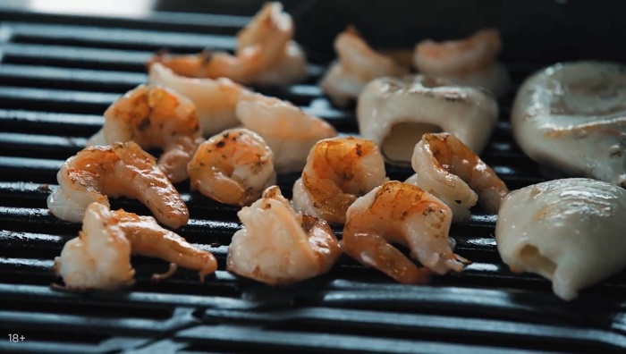 Креветки и кальмары (предварительно сбланшированные) поливаем оливковым маслом и обжариваем на гриле. -