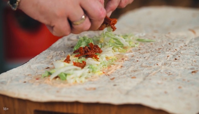 Разворачиваем лаваш, смазываем его соусом, выкладываем поверх немного салата, вяленных томатов, огурца и много начинки из морепродуктов, немного поливаем соком лайма и заворачиваем шаурму. -