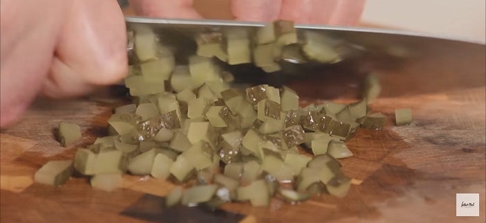 Боковые огурцы тоже нарезаем мелким кубиком. -