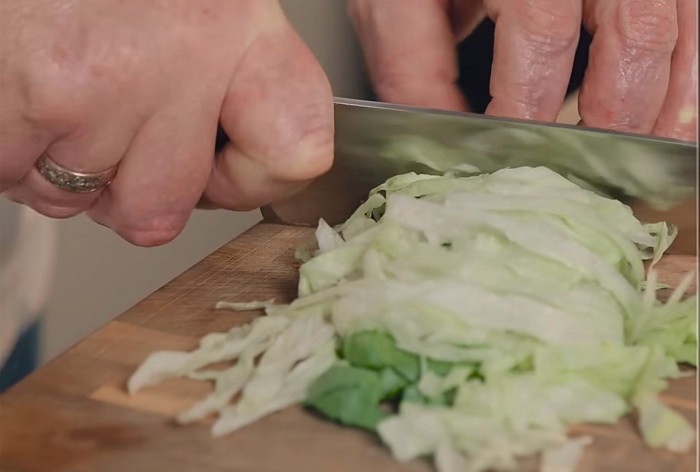Листья салата айсберг нарезаем соломкой, а томаты кубиком. -