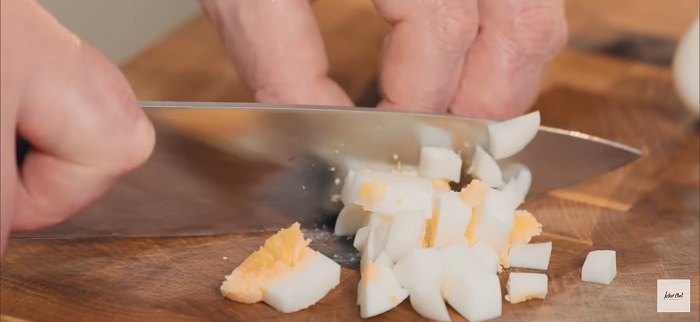 Отварные яйца нарезаем кубиком, перекладываем в миску, добавляем майонез и перец. -