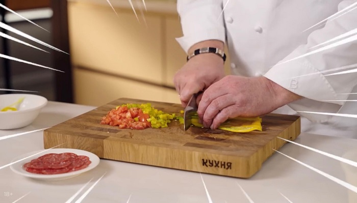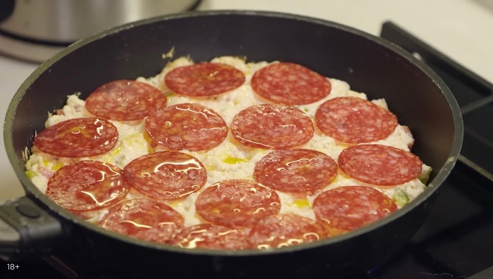 Выкладываем на пиццу нарезанную салями, слегка поливаем оливковым маслом, прижариваем пиццу на среднем огне около 4 минут. -