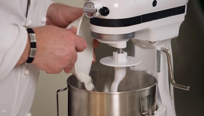 Сначала замесим тесто. В дежу вливаем яйцо, добавляем муки, разрыхлителя, соли и замешиваем, вливая молоко. -