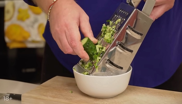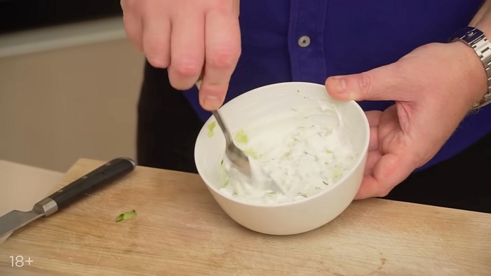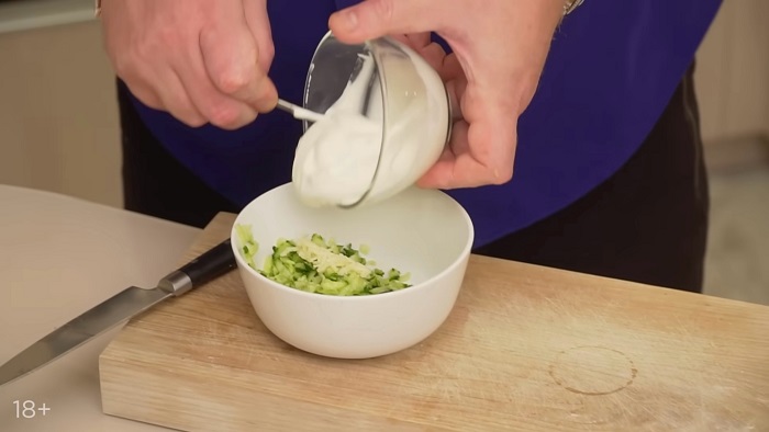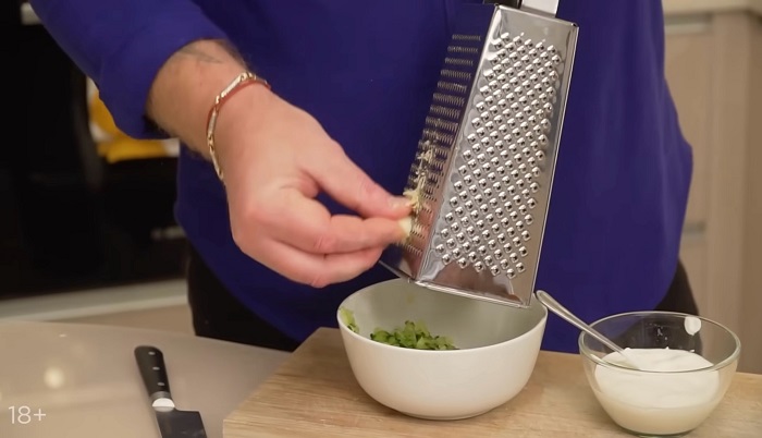 Для соуса - огурец натираем на крупной терке, хорошо отжимаем, натираем чеснок, добавляем сметаны. -