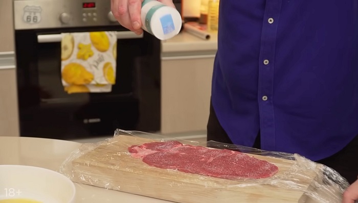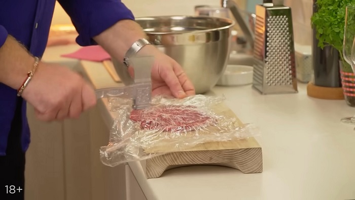 Мясо оборачиваем пищевой пленкой и отбиваем. -