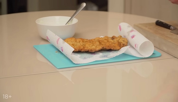 Опускаем мясо во фритюр с раскаленным маслом, обжариваем до золотистой корочки с двух сторон и перекладываем на салфетку. -