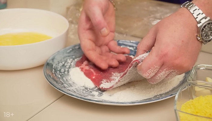 Мясо солим с двух сторон, обваливаем сначала в муке, затем опускаем во взбитое яйцо, а после - в панировочные сухари. -