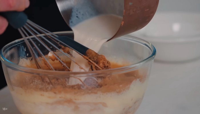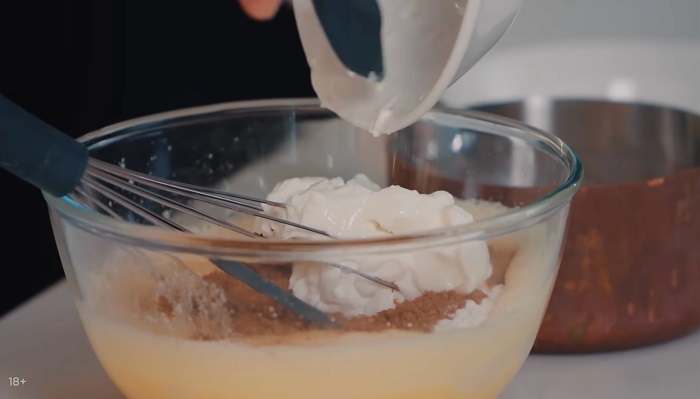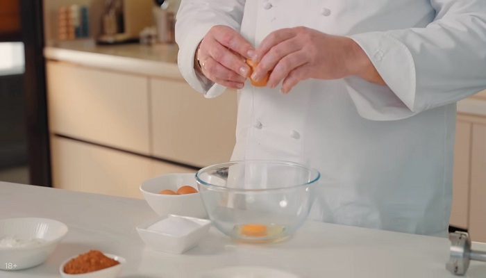 В миску разбиваем яйца, добавляем к ним эритрит и пробиваем всё блендером до однородной массы. -