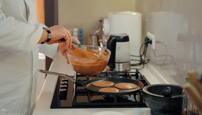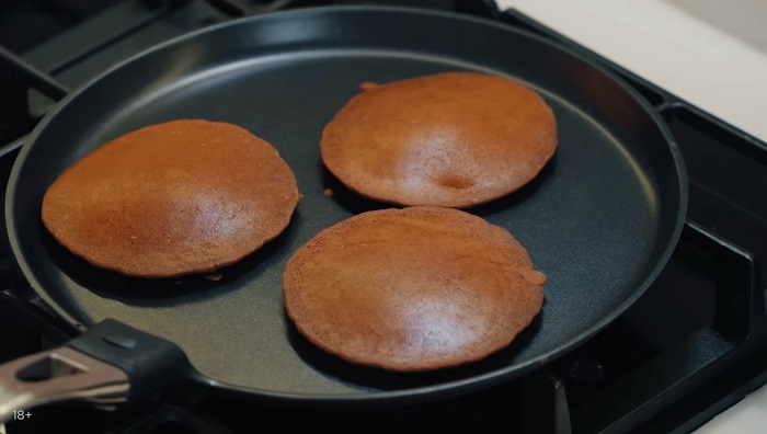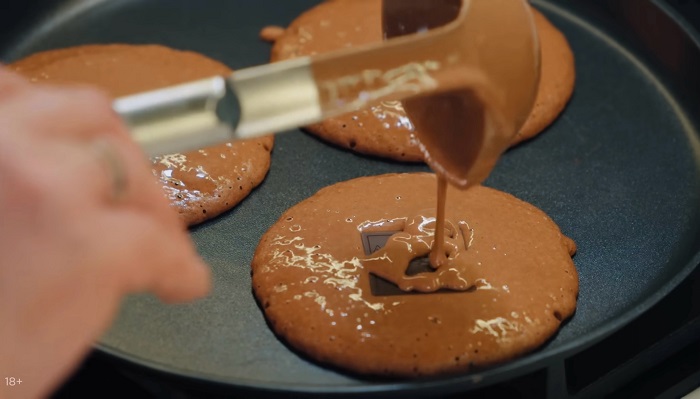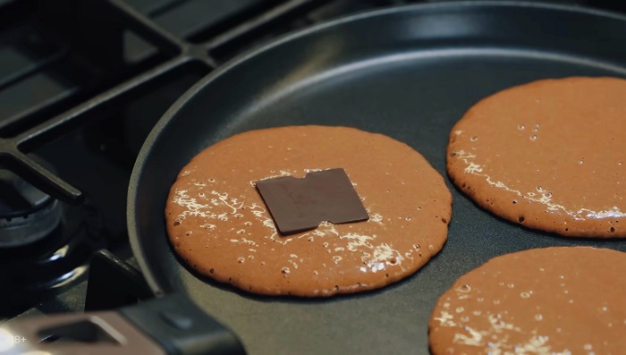 На сухую накалённую сковороду половником вливаем тесто, в центр каждого оладушка кладём кусочек шоколада, сверху закрываем тестом. Обжариваем с двух сторон и наши правильные шоколадные оладья о шефа готовы. Приятного аппетита!