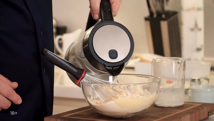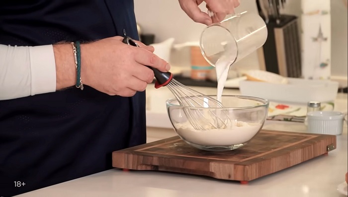 Вводим молоко, немного воды, подмешиваем венчиком до однородности. -