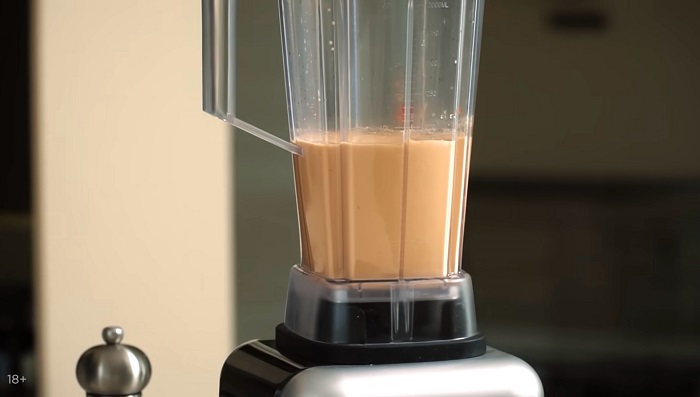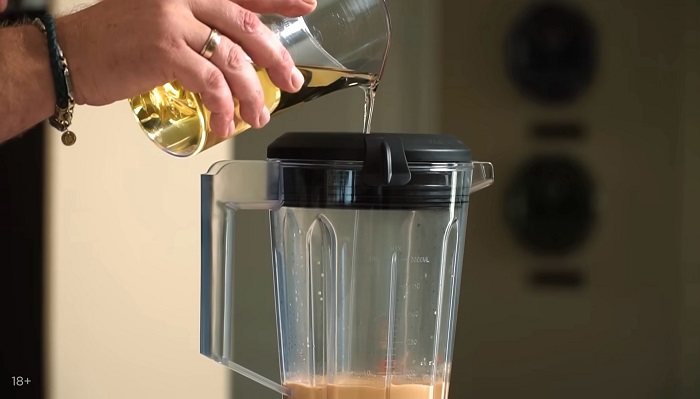 Постепенно вводим растительное масло, продолжаем пробивать, а затем убираем соус в холодильник. -