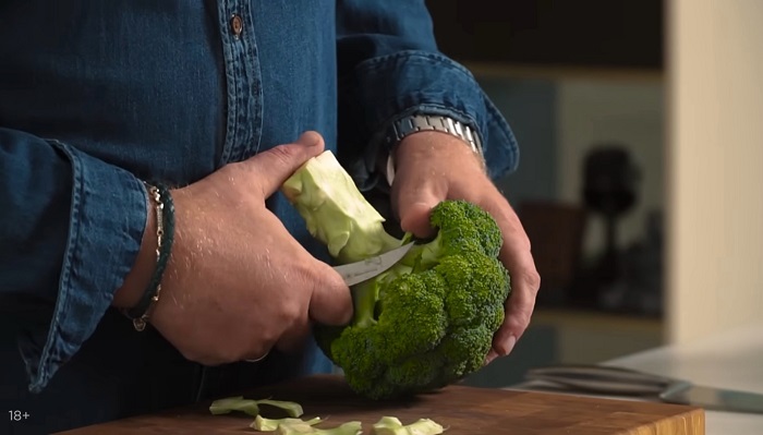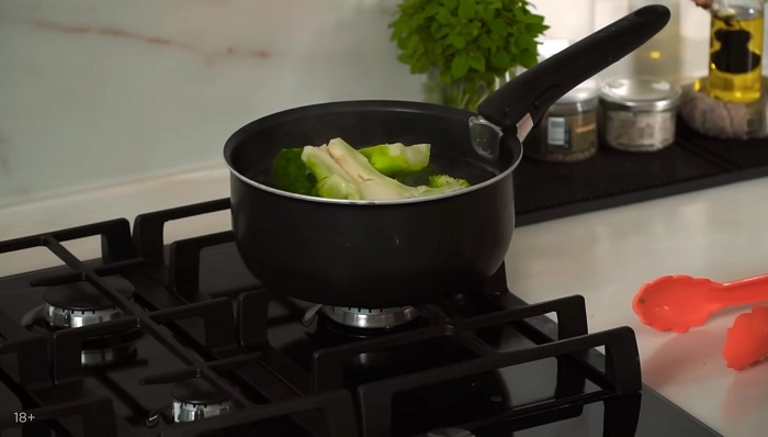 Брокколи подчищаем, разрезаем качан пополам и закладываем в кипящую подсоленную воду, приварить до полуготовности, а затем откидываем под холодную воду. -